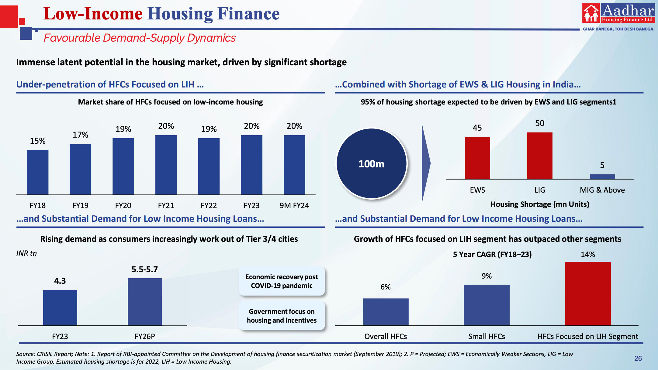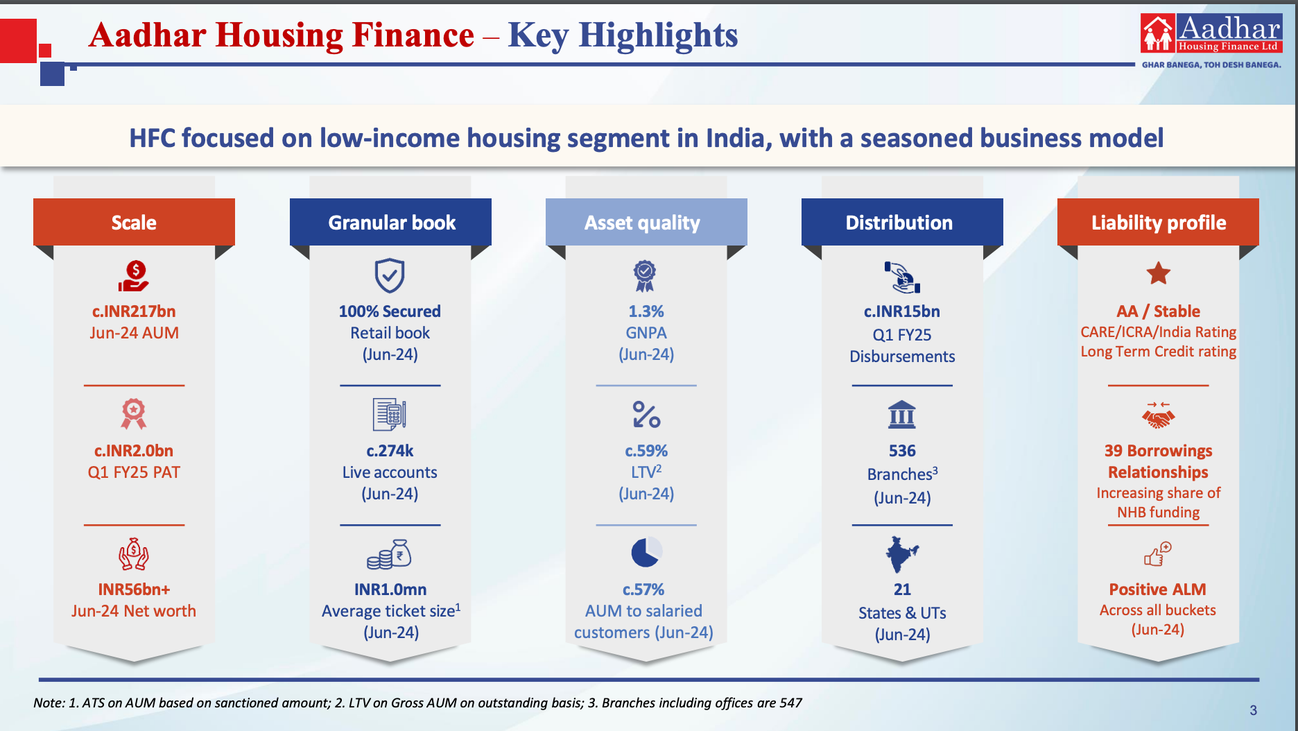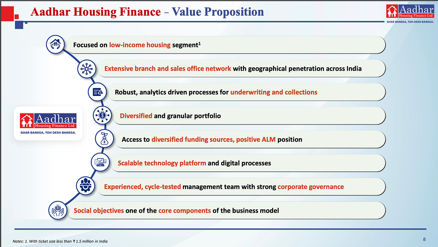 Aadhar Housing Finance is a technology backed housing loan company focused on the low-income housing segment. Their average ticket size is ~ ₹10 lacs.