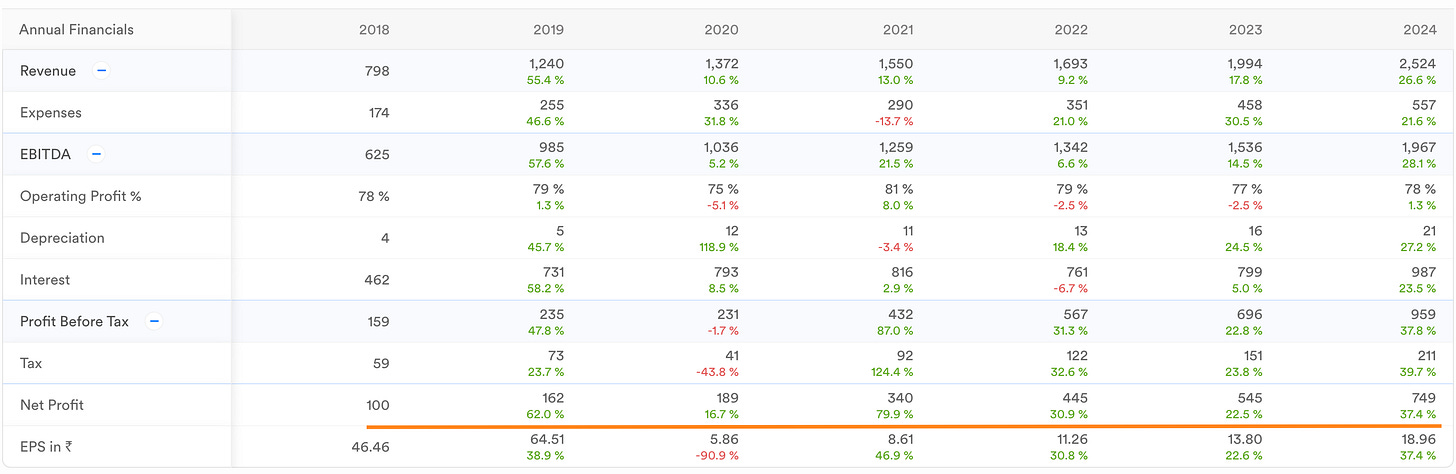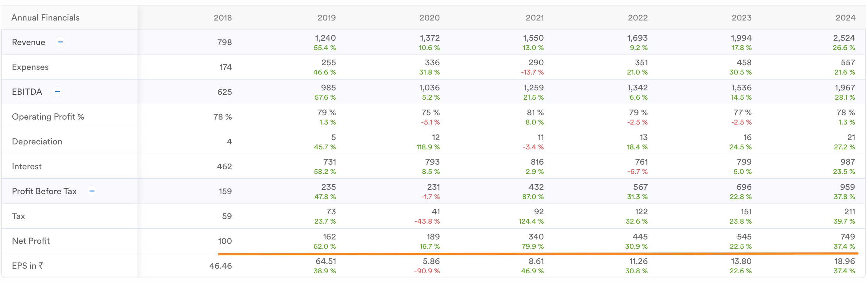 The company has a consistent track record of growing net profit from 100Cr in FY 2018 to 749Cr in FY 2024. The net profit and EPS increased by 37.4% in FY 2024.