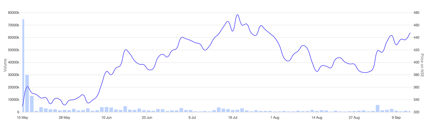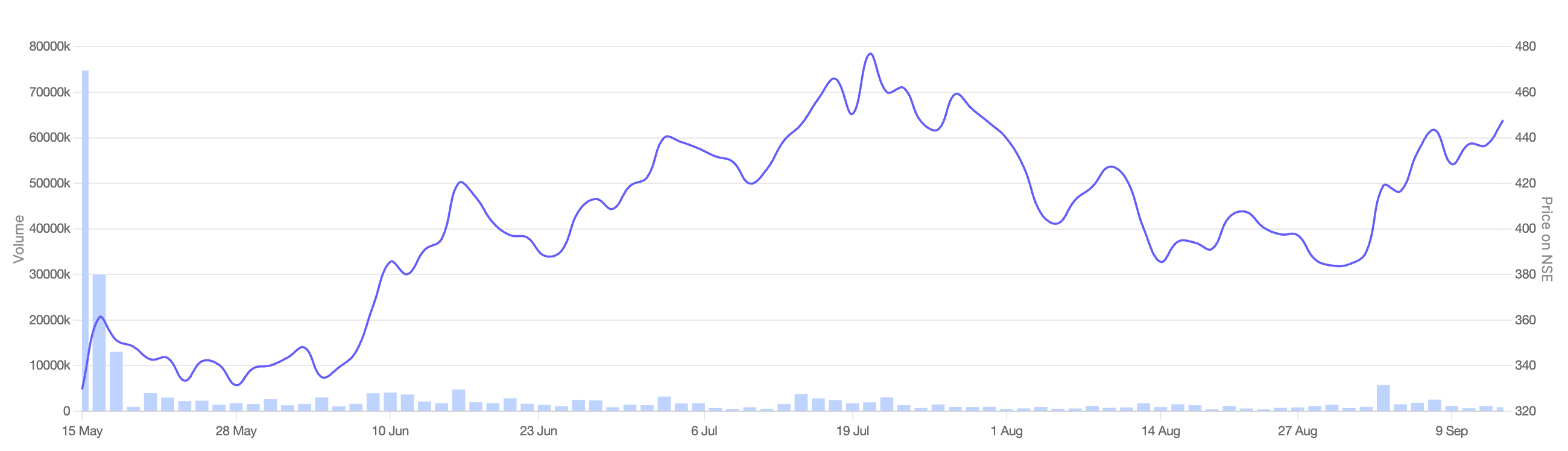 Last closing price(NSE:AADHARHFC) - ₹457.8 (as on 12-Sep-2024)