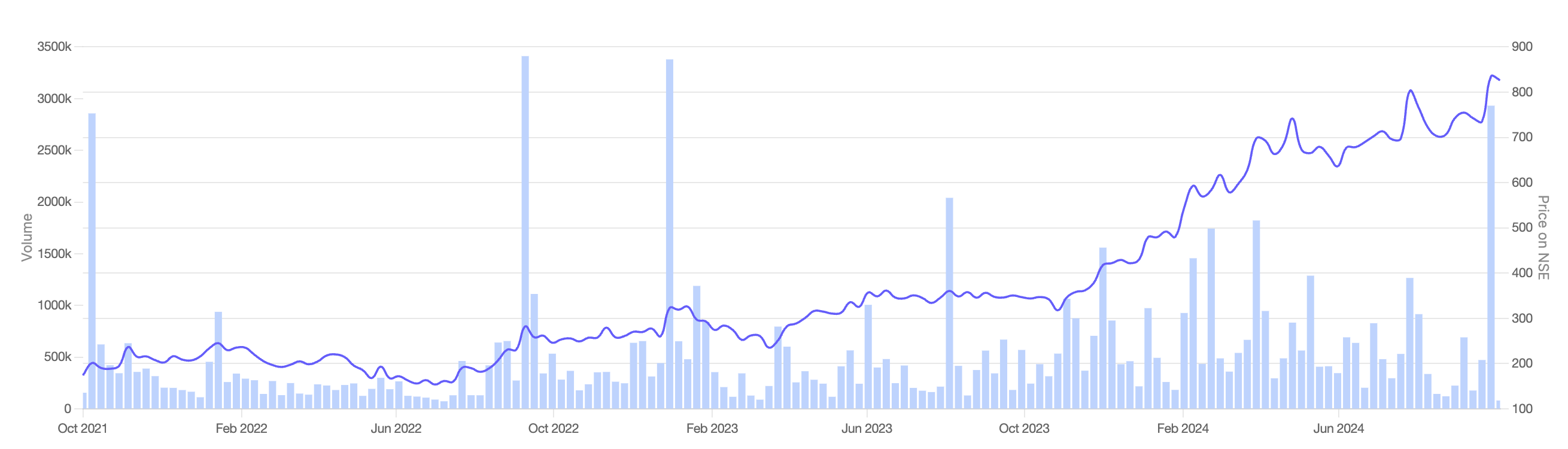 Last closing price(NSE:ARVSMART) - ₹826.45 (as on 30-Sep-2024)