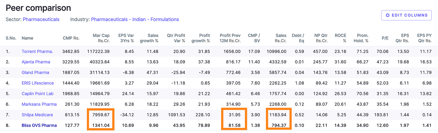 The company’s total sales are 49% lower than Shilpa Medicare , a company of the same sector, but the market cap is lower by 593%. This shows a potential for growth in market cap for Bliss GVS.