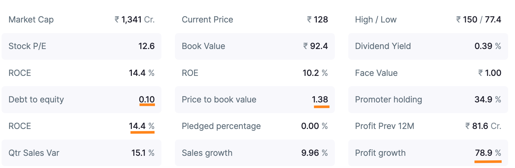 Debt in control at 0.1 and healthy ROCE at 14.4%.