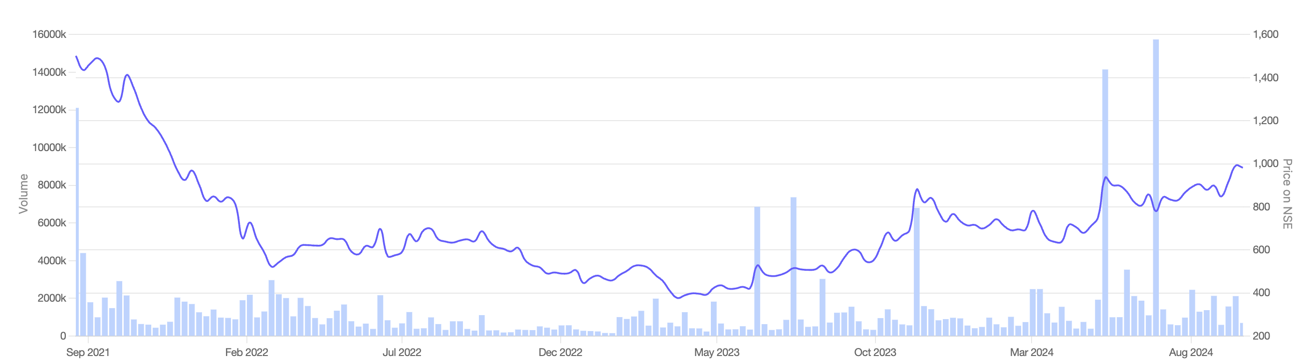 Last closing price(NSE:CARTRADE) - ₹981.8 (as on 18-Sep-2024)