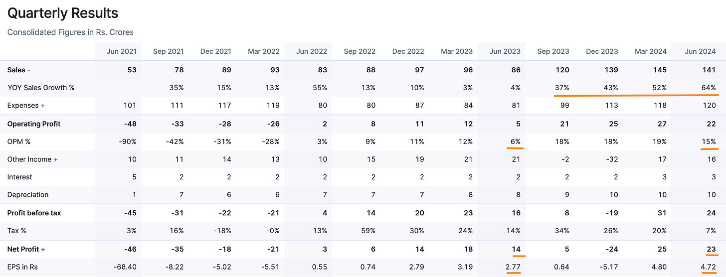The company has had a consistent track record of 35%+ sales growth in the last 4 quarters. The latest quarter sales growth was +64%.
