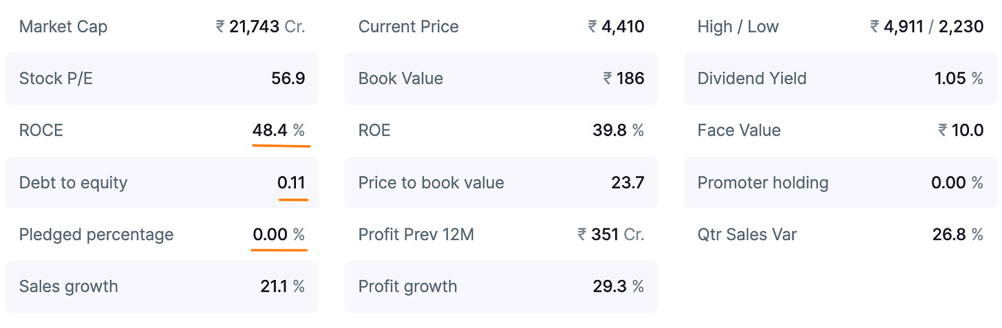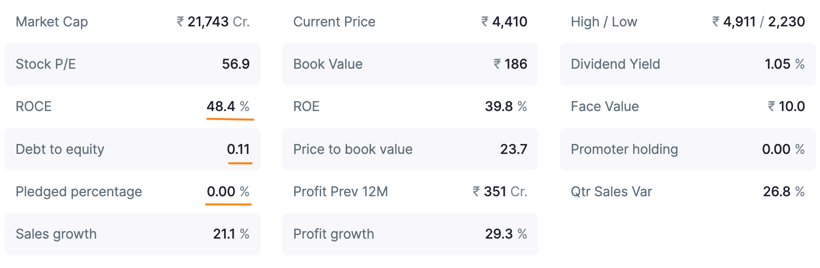 The debt-to-equity is low at 0.11 and the ROCE is very strong at 48.4%.