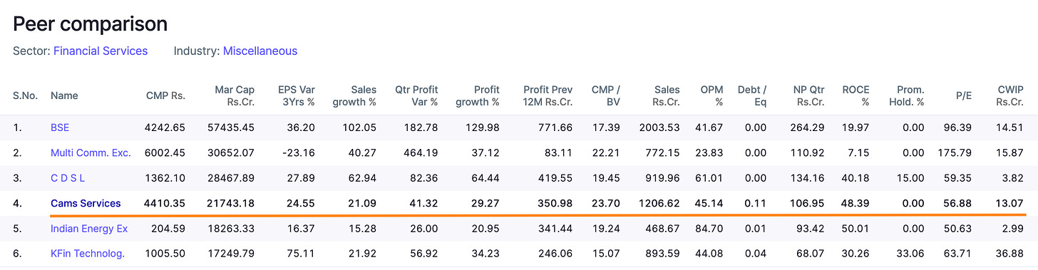 The nearest peer in the range is CDSL with a net profit of ₹419.55 Cr in the last 12 months, and market cap is higher by 33%. CAMS Ltd is currently at ₹350.98 Cr as last 12-month profits.