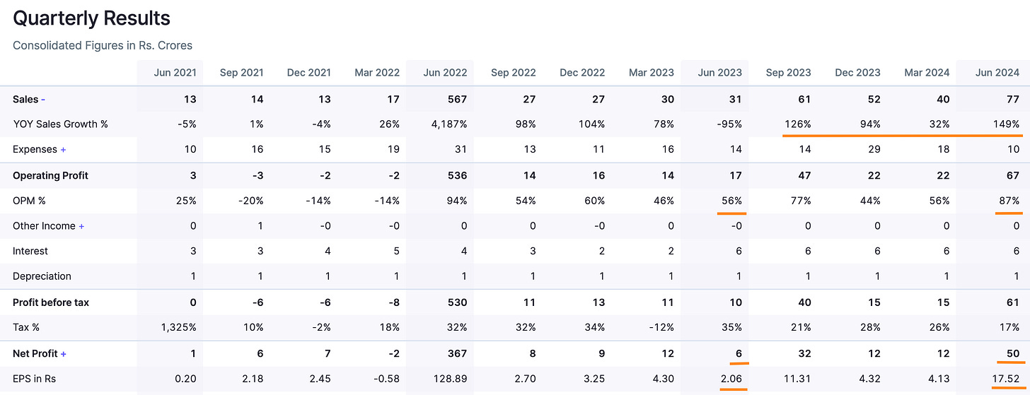 Latest quarterly results - sales growth reported at +149%, +55% increase in operating margin (OPM) and 8.5X increase in EPS.