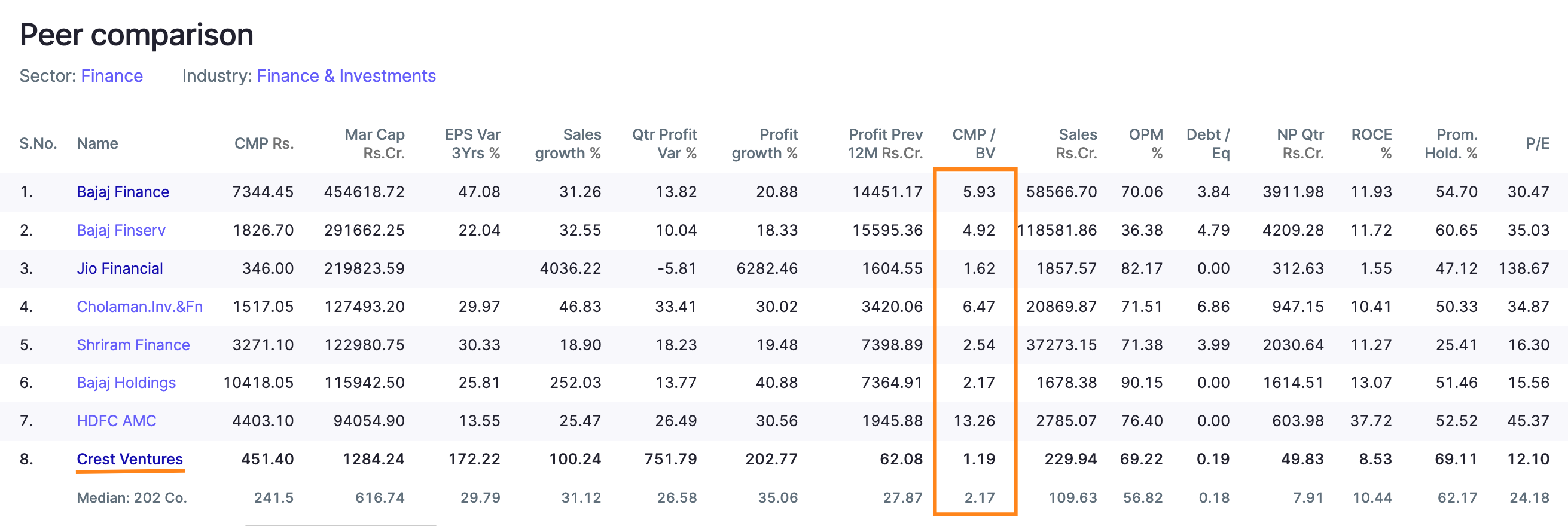 The book value of the peers in the financial services domain is between 2 to 5, with median being 2.17.