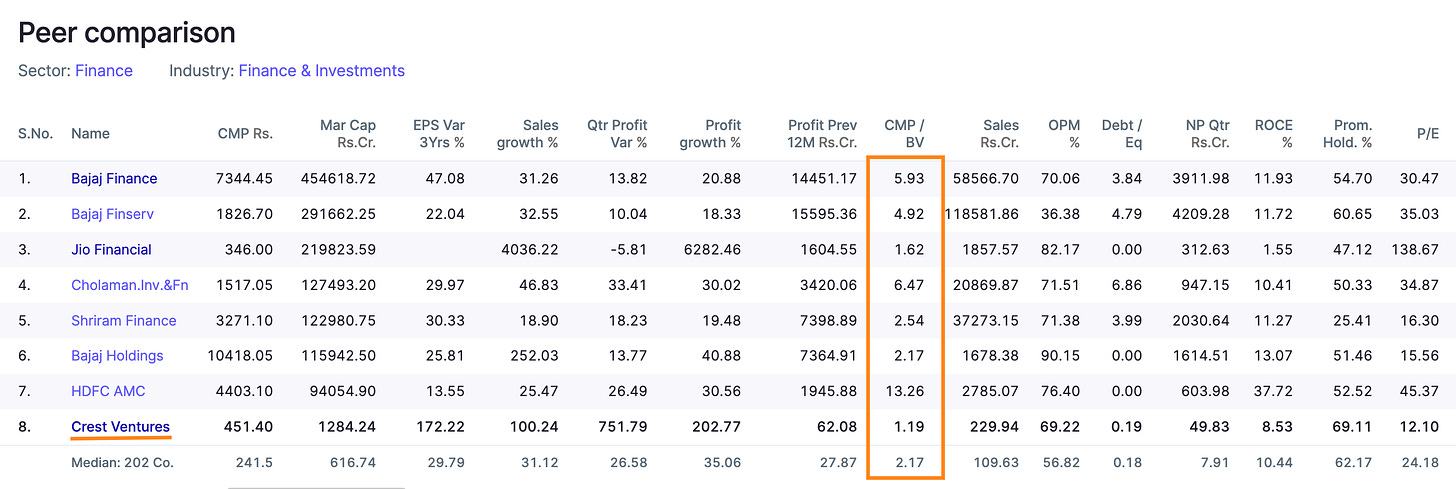 Crest Ventures Ltd has a PBV of 1.19 currently which shows potential for the market cap and hence stock price to grow if the company is able to maintain the growth rate.