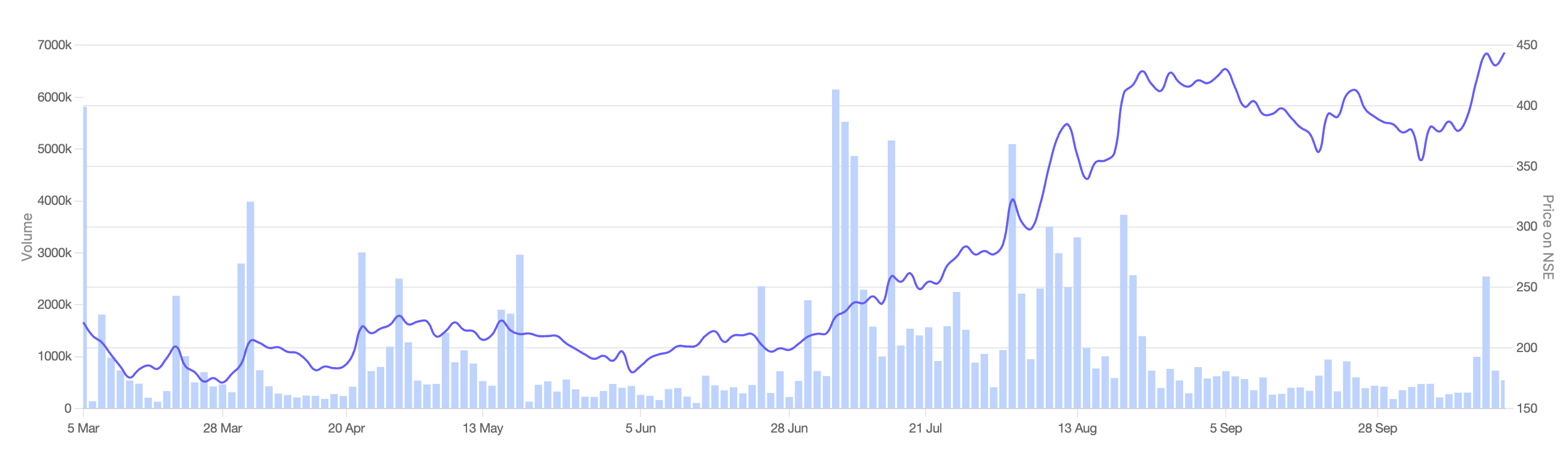 Last closing price(NSE:PLATIND) - ₹447.1 (as on 18-Oct-2024)
