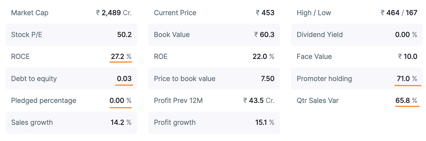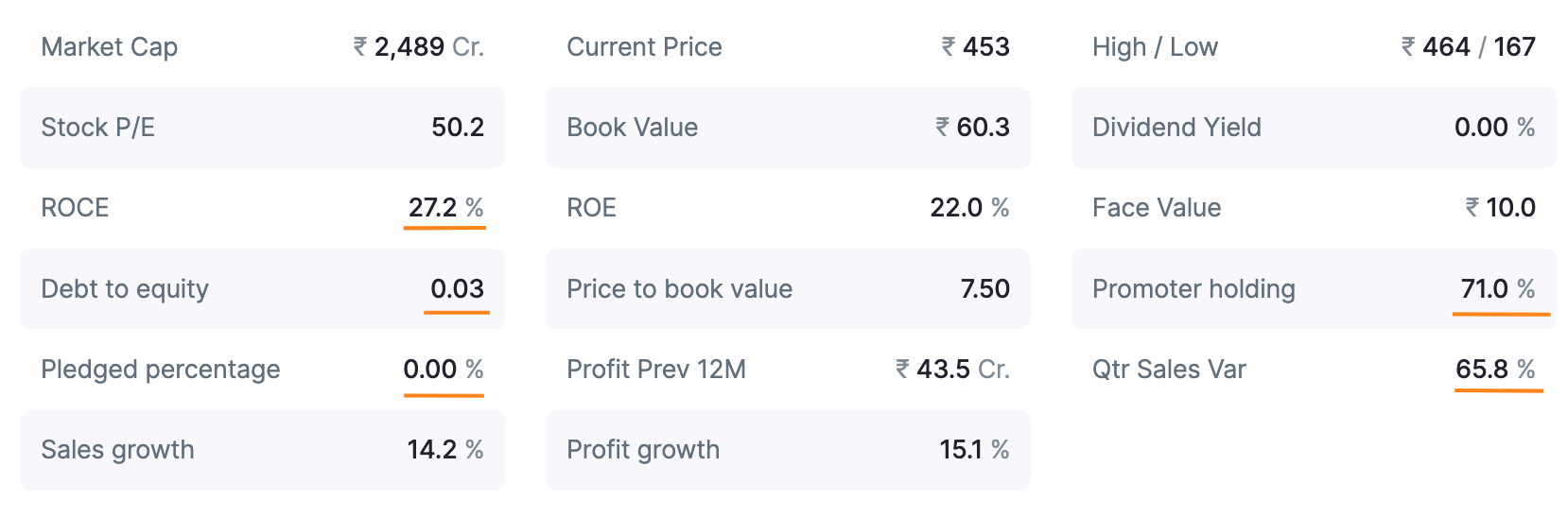 The company is almost debt-free with debt-to-equity of 0.03 and the ROCE is strong at 27.2%.