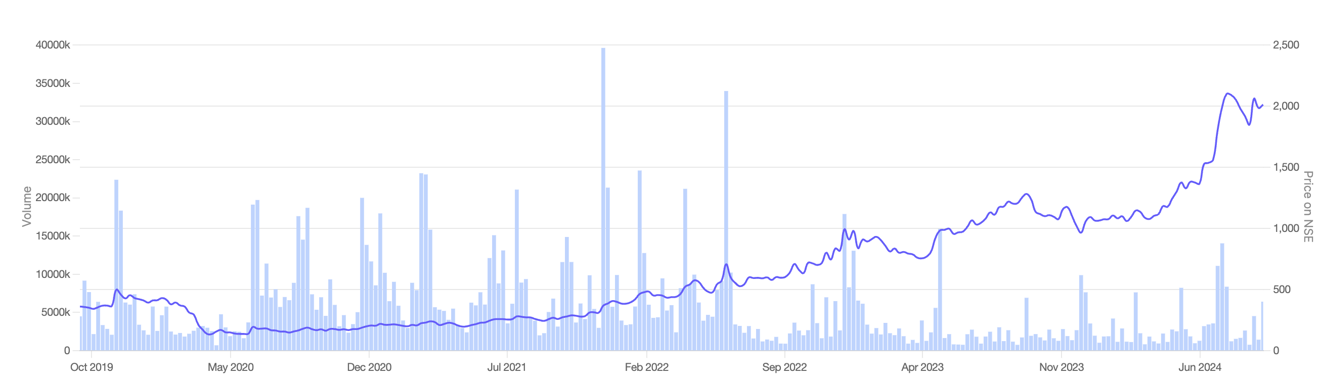 Last closing price(NSE:RAYMOND) - ₹1998.8 (as on 06-Sep-2024)