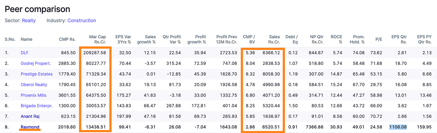 The company’s sales from real-estate is ~ 3521Cr(considering 54% revenue share). The real-estate peers with similar sales have 2x to 4x market cap.