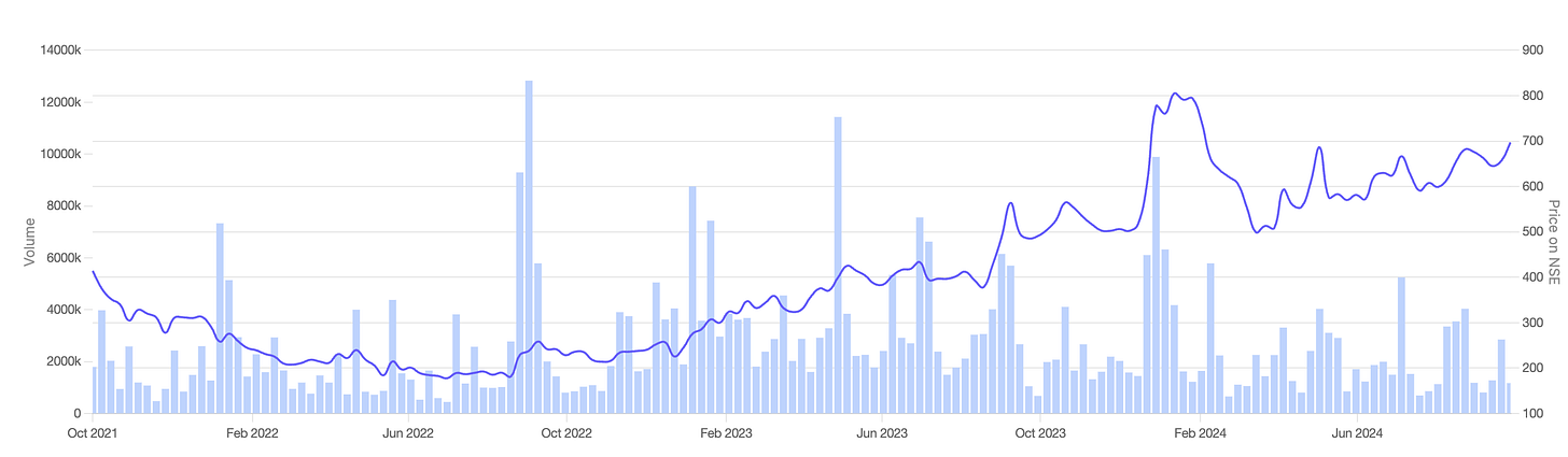 Last closing price(NSE:SURYAROSNI) - ₹732.35 (as on 03-Oct-2024)